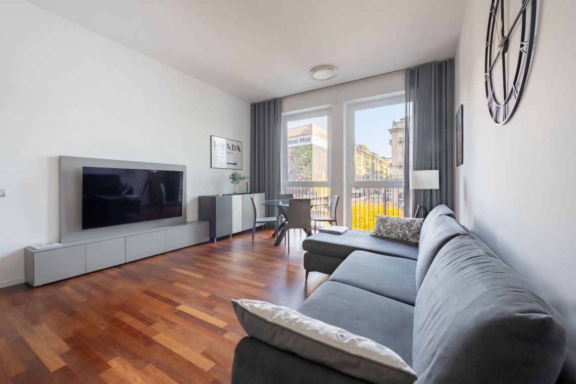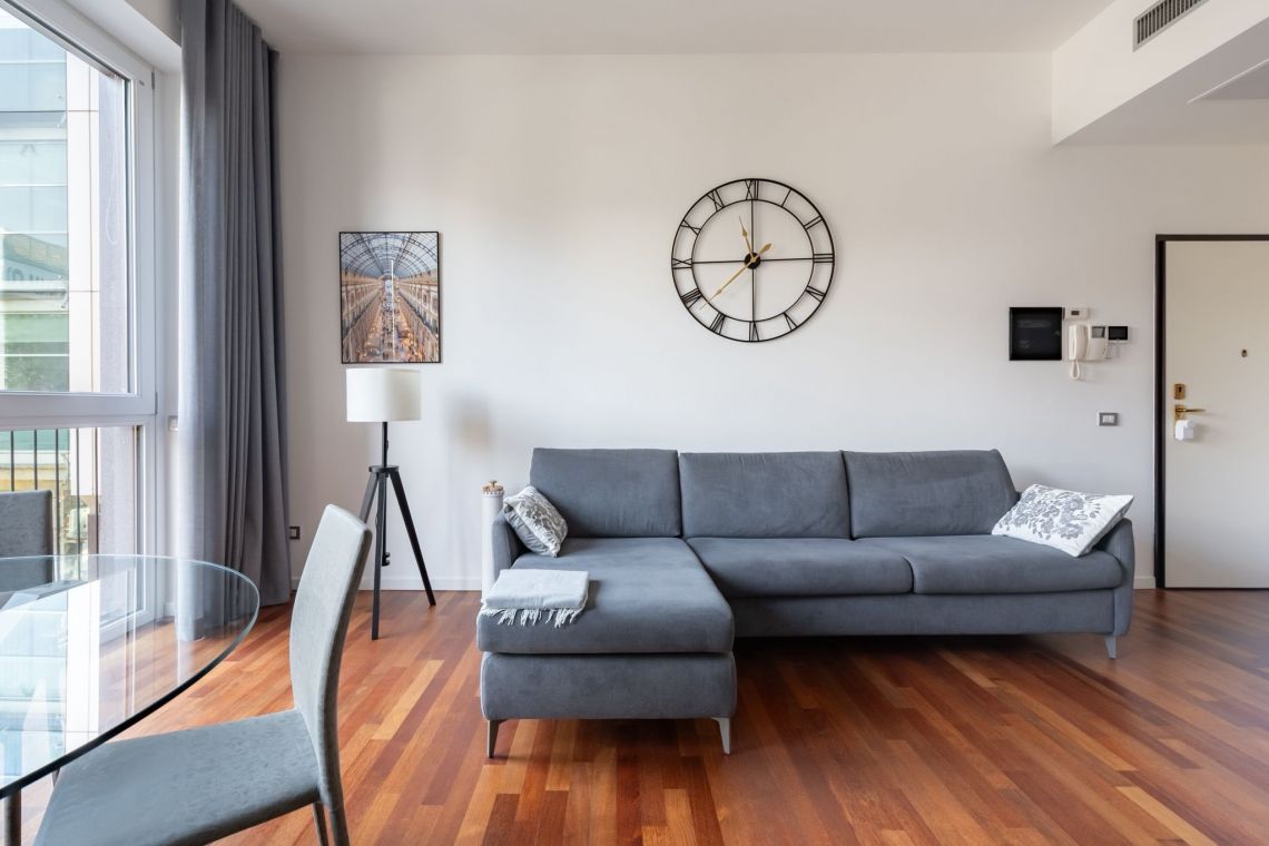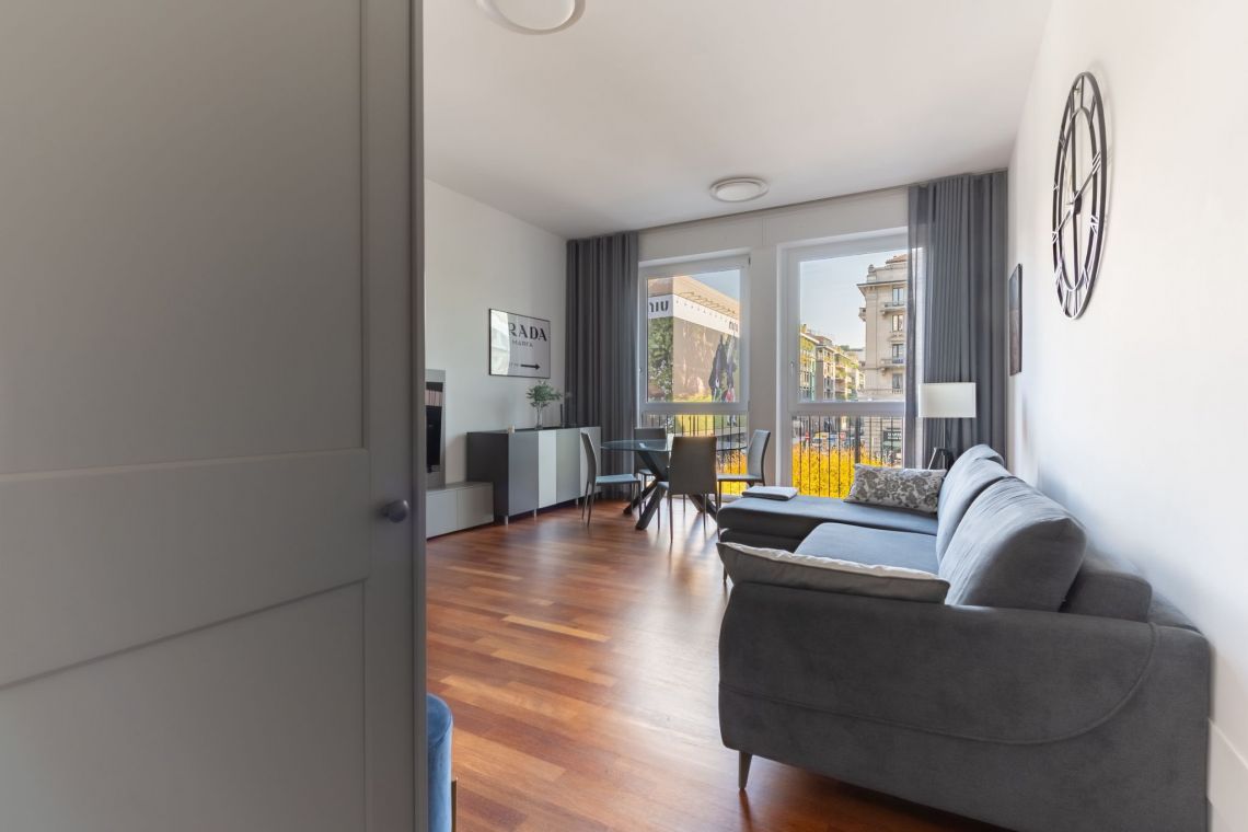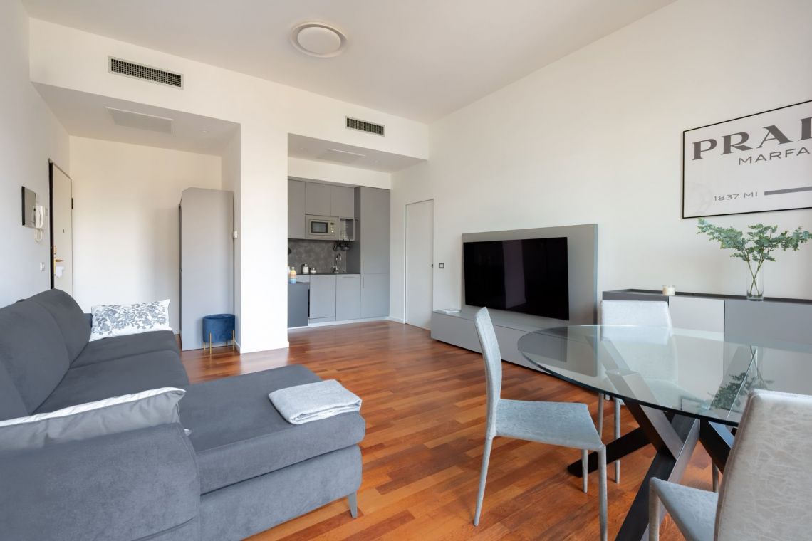 Il Luminosissimo appartamento, dal design contemporaneo, si compone di un ampio soggiorno doppio con grande vetrata che regala una splendida vista sul quadrilatero più vip di Milano, divano letto e con angolo cottura elegante e funzionale.