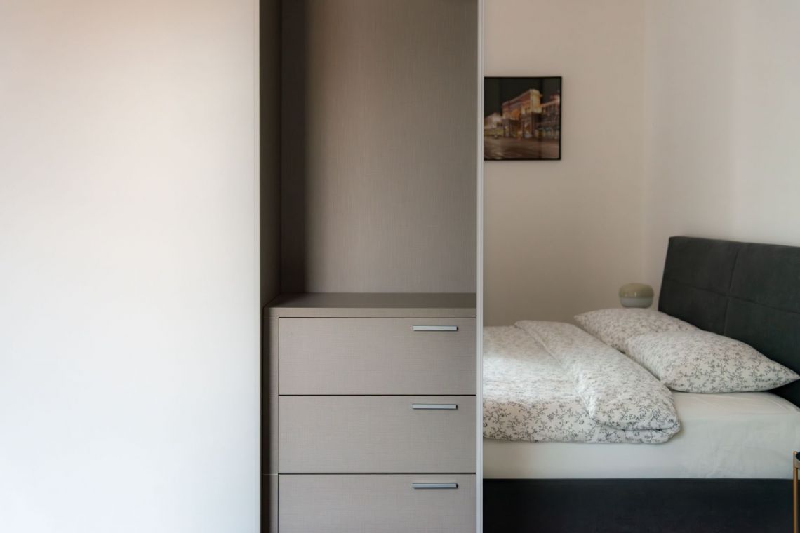 La camera matrimoniale, ampissima e silenziosa, ospita un letto king size e arredi di gusto essenziale.