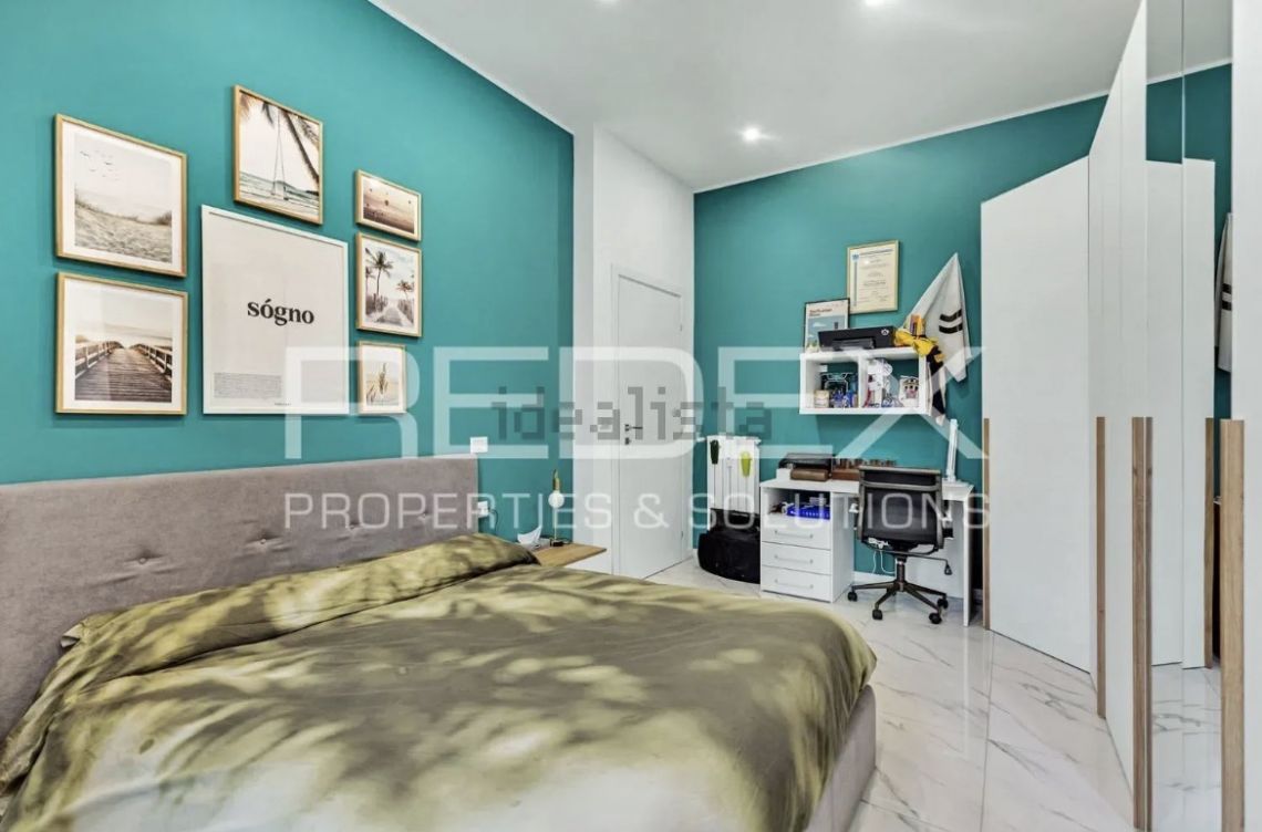 La zona notte, separata e riservata, ospita una spaziosa camera matrimoniale, luminosa e silenziosa, dotata di ampia armadiatura su misura, cabina armadio angolare con illuminazione dedicata e angolo scrivania attrezzato, ideale per lo smart working o lo studio.
