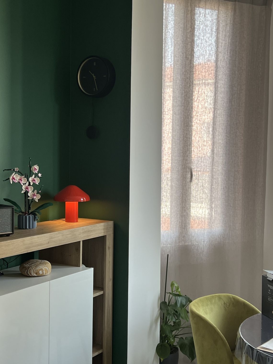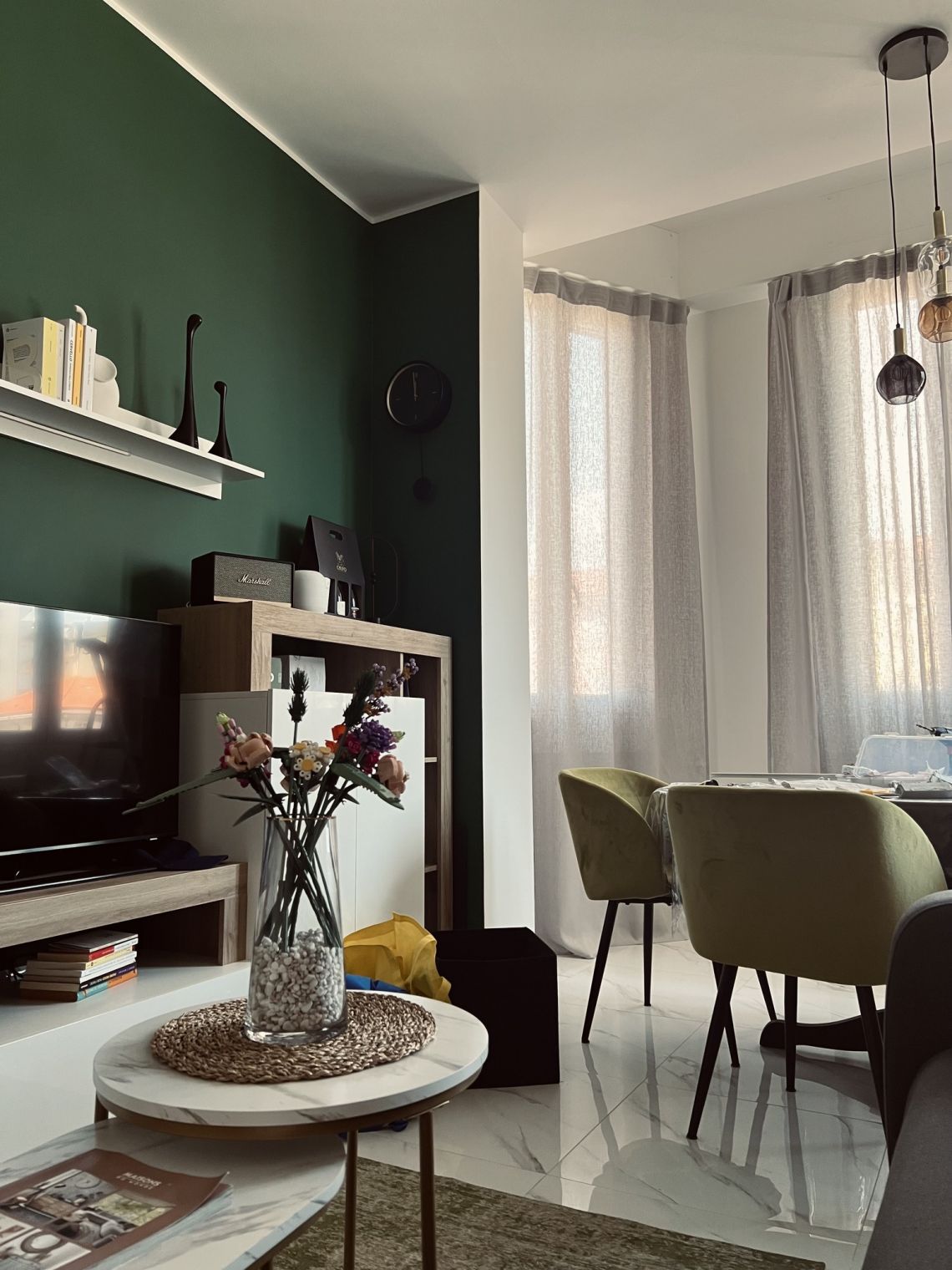 Il soggiorno, ampio e accogliente, è impreziosito da una suggestiva bow window su misura, elemento architettonico di grande fascino che dona profondità e luce naturale, creando un'atmosfera calda e distintiva. L'area relax è completata da un comodo divano letto con materasso alto 20 cm, ideale anche per ospiti.